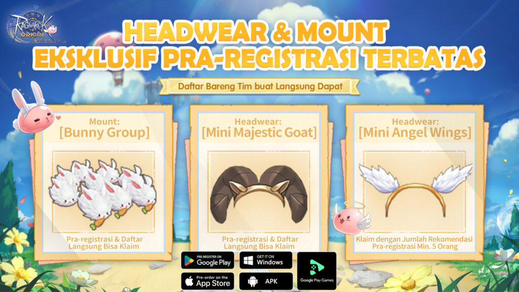 Ragnarok Origin Classic kini telah membuka pra-registrasi untuk wilayah Hong Kong, Makau, Taiwan, Asia Tenggara, dan Korea. Pemain yang melakukan pra-registrasi berkesempatan mendapatkan berbagai hadiah eksklusif, seperti Mount Bunny Group dan Headwear Mini Majestic Goat.